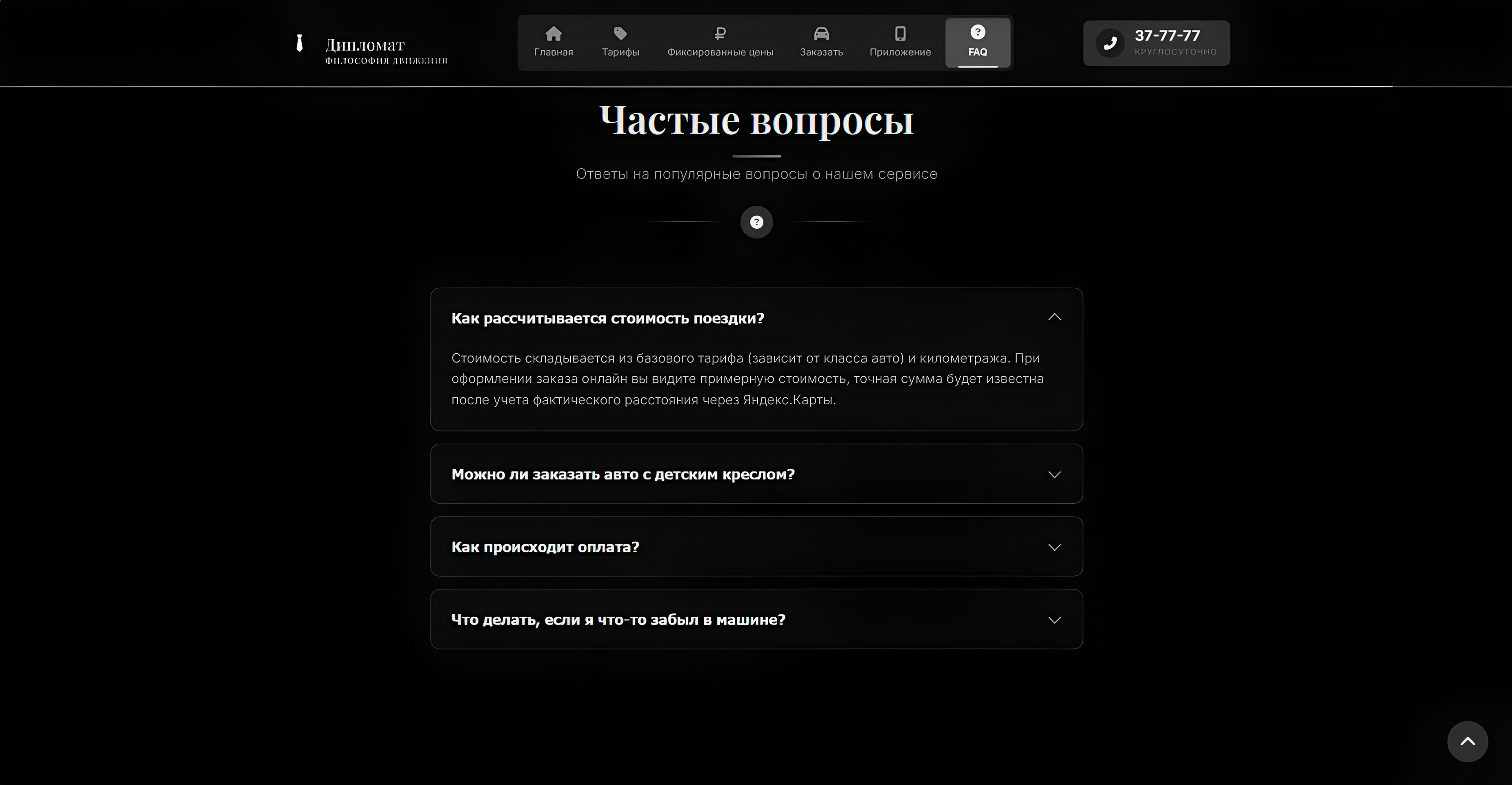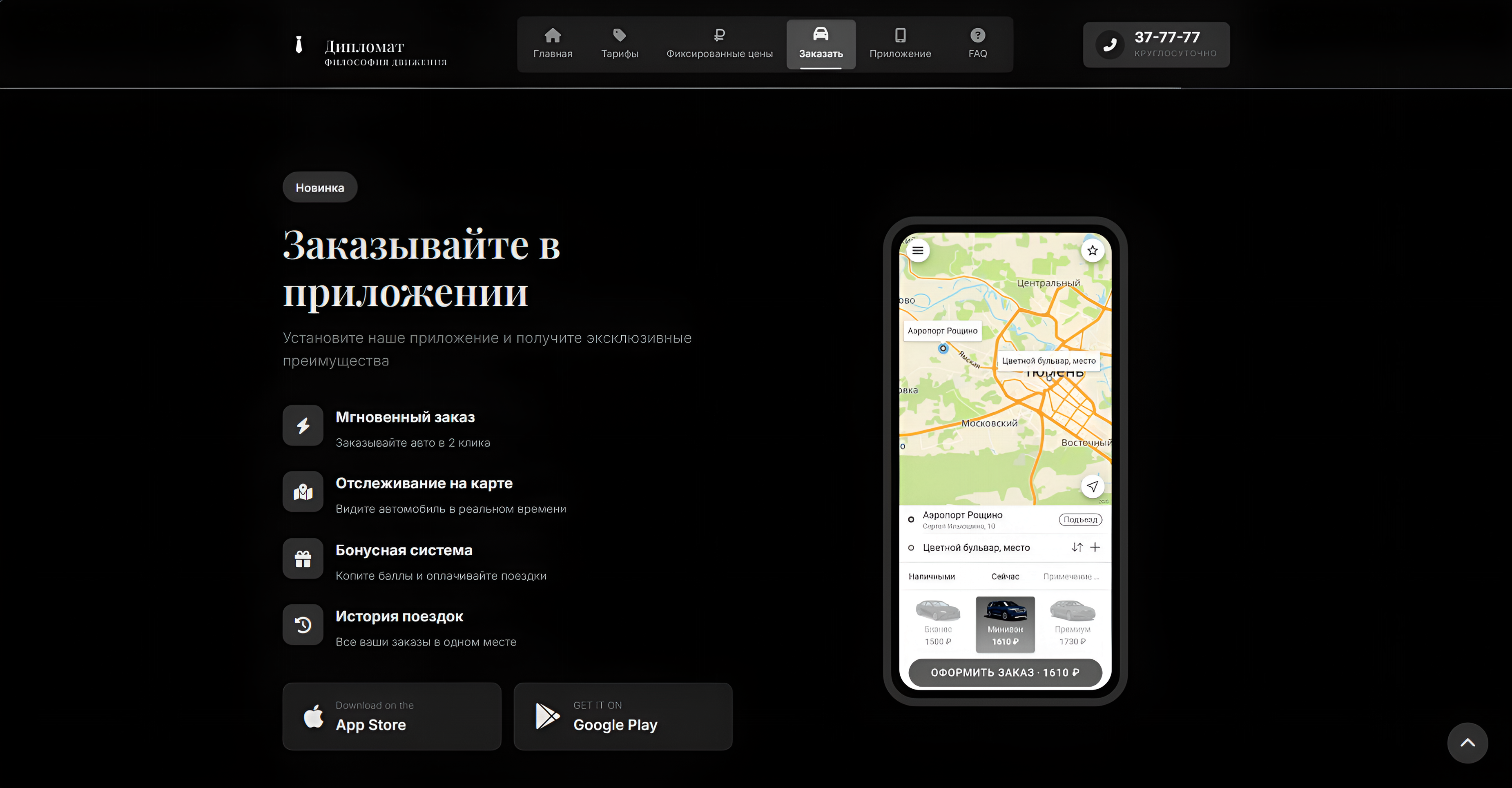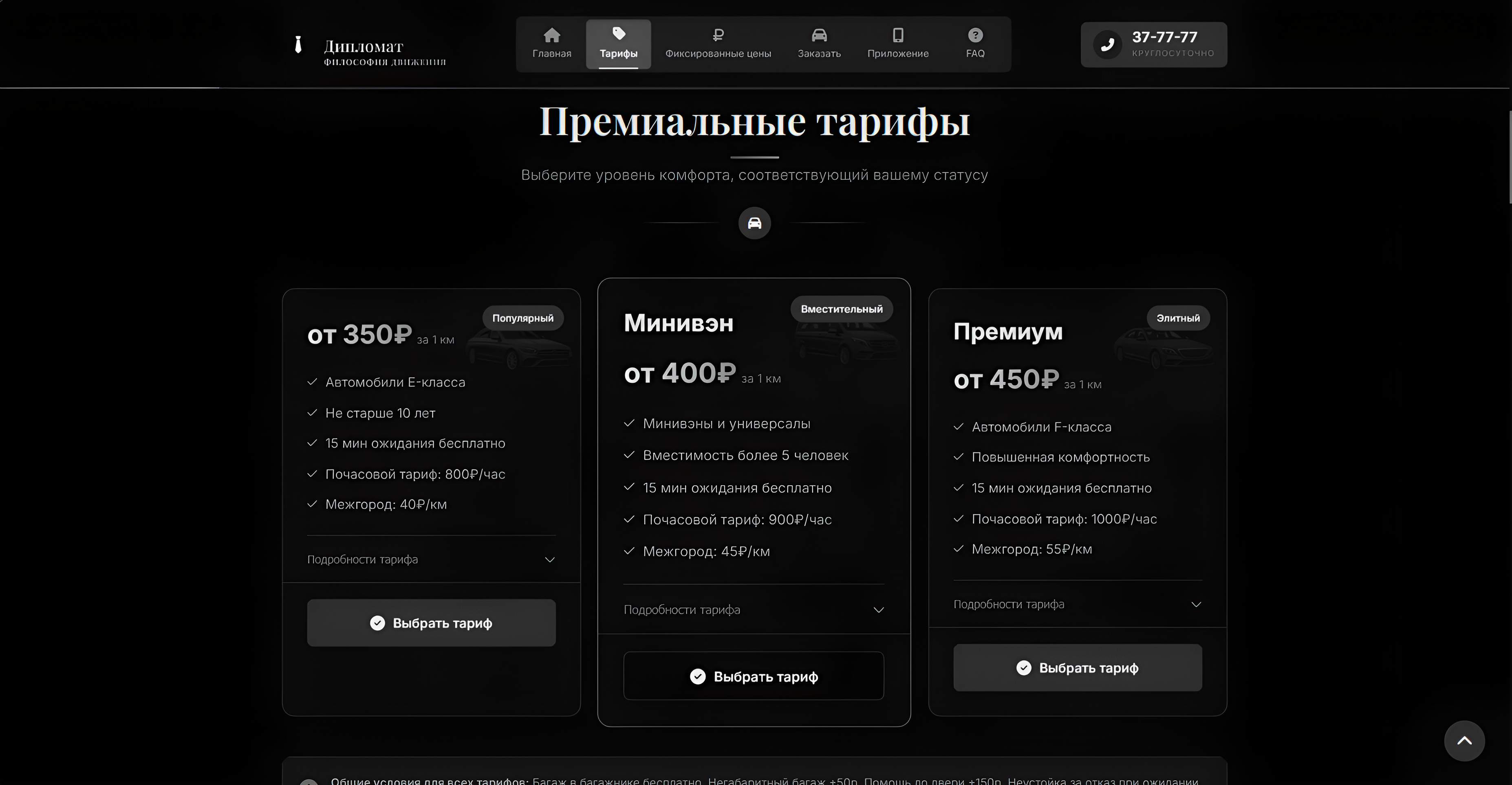 Премиальный лендинг транспортного сервиса: тёмная эстетика, крупная типографика и акцент на доверии.